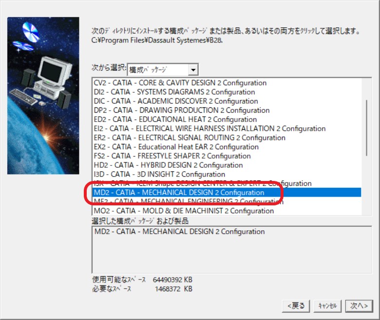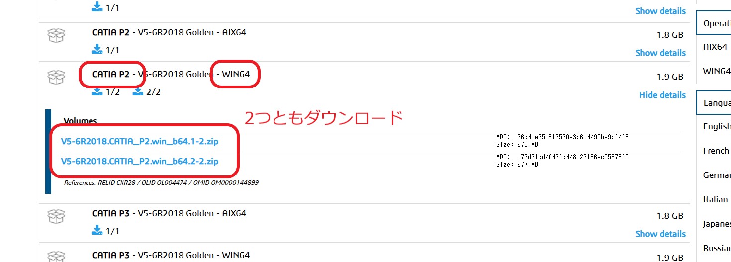 - 弊社のライセンスは「MD2」のため、「CATIA P2」の「win_b64」にある2つのファイルをダウンロードします。