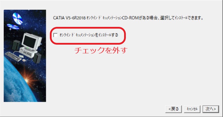 - オンラインドキュメントは後でインストールするため、チェックボックスを外して進めます。