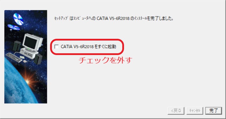 - インストールが終了したら、「すぐに起動」のチェックを外して「完了」ボタンを押します。