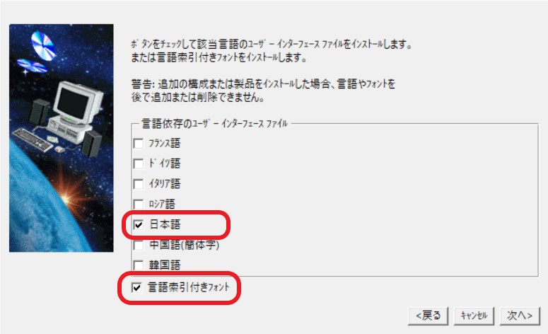 - この画面では、「言語依存のユーザーインターフェースファイル」は日本語だけにし、