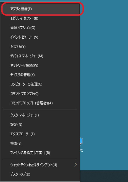 - スタートボタンを右クリックし、「アプリと機能」を選択します。