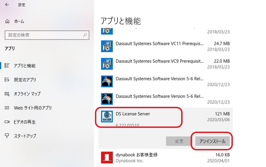 - 一覧から「DS Lisence Server」を選択し、「アンインストール」をクリックします。