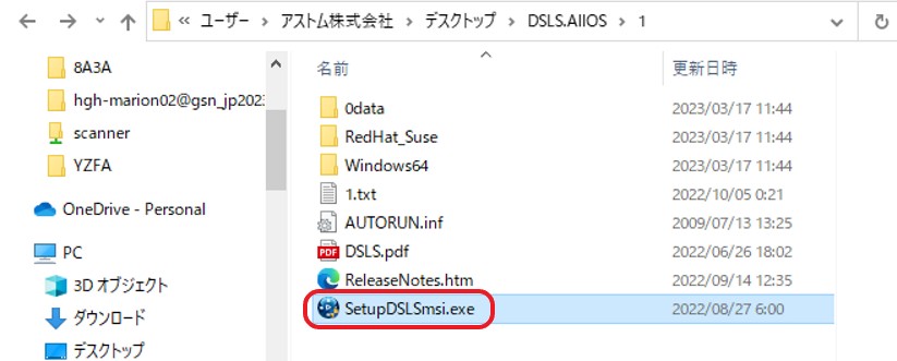 - 「DSLSAllOS\1」のフォルダにある「SetupDSLSmsi.exe」を実行します。