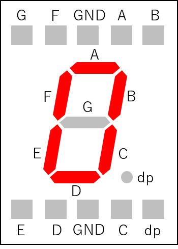 信号ピンは10個存在するが、数字の表示に使用するのが、7つ、右下のドット表示に使用するのが1つ、GNDに接続するのが2つとなっている。